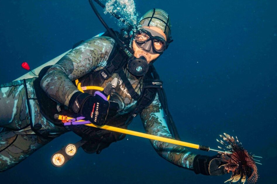 Our policy is that guests who want to do a lionfish hunt must sign up ahead of time so that we can arrange the necessary safety measures and we require a minimum of 2 lionfish hunters. First, we conduct a short training session for the guests at our dive center before the lionfish hunters even leave the dock. We boil water and carry several thermoses of boiling hot water as that is needed for treating any lionfish stings, in addition to carrying a first aid kit. While doing the lionfish hunt, our dive master carries the container to collect the lionfish (we do not feed them to sharks and eels and other fish underwater as that affects fish behavior) and our dive master puts the speared lionfish in the container rather than have the guest do it to reduce the chances of injury.